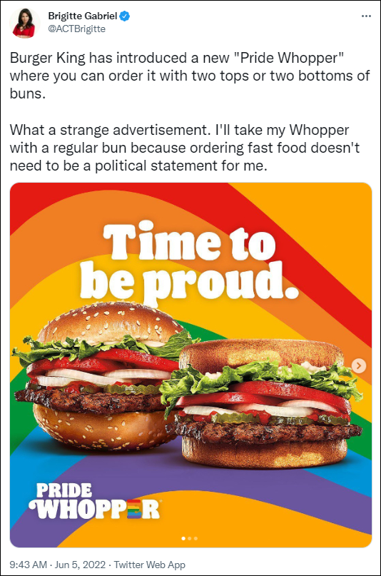 其中,美国保守派作家布里吉特·加布里埃尔(Brigitte Gabriel)还在推特上直言,“这是一个奇怪的广告。我只会点普通款小圆面包的汉堡,因为点快餐对我来说不需要成为一种政治声明。”