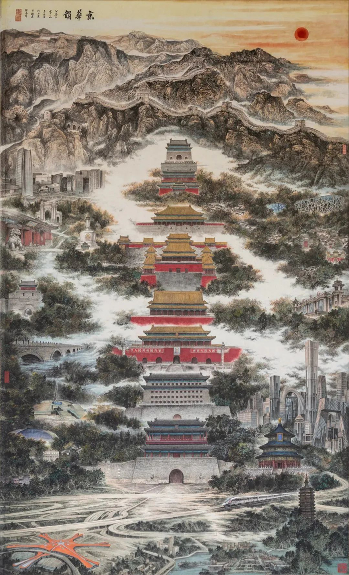 永定门、先农坛、天坛、正阳门及箭楼、毛主席纪念堂、人民英雄纪念碑、天安门广场、天安门、社稷坛、太庙、故宫、景山、万宁桥、鼓楼及钟楼,中轴线上的这14处申遗点是北京建筑的精华点萃,承载了古都灿烂悠久的历史文化。美术家们用画笔勾勒出中轴线的壮美,也描绘出周边建筑景观、自然景观与人居环境和谐统一的美好画卷。
