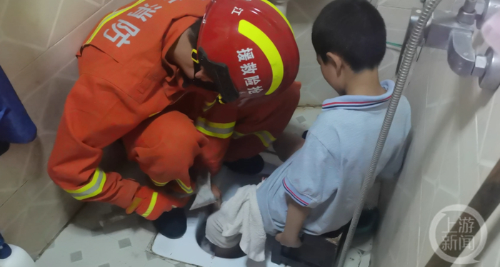 黔江区消防救援支队指战员到达现场看到,厕所内有一名小男孩的左脚被蹲便器卡主,小男孩卷缩着坐在地上,一直低着头不肯说话,情绪比较低落,由于被困时间较长,脚踝已有些肿胀。