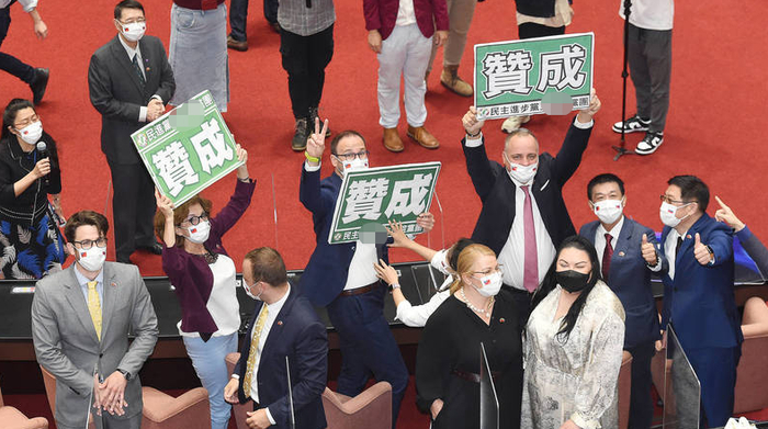 近些年,每当遇到需要进行表决的议题时,民进党经常挟人数优势强行过关。今天,“访问团”成员还装模作样拿起表决时所用的“赞成”手板。