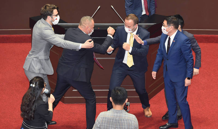 岛内蓝绿“立委”曾多次在“立法院”爆发大混战,彼此泼咖啡、洒水、扔猪内脏、猪皮、丢水杯、砸箱子……曾被法新社、BBC、CNN等多家外媒报道,成为国际笑柄。