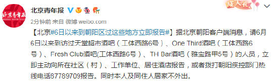 请6月6日以来到访过朝阳区天堂超市酒吧(工体西路6号、工体北路13号)、One Third酒吧(工体西路6号)、Fresh Club酒吧(工体西路6号)、PH酒吧(工体西路6号)的人员,立即主动向所在社区、工作单位、居住酒店报告,同时本人及同住人居家不外出。