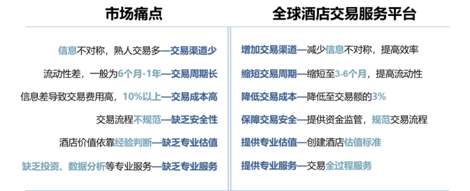 张羽翀认为,酒店资产交易的核心痛点在于信息不对称。而信息不对称演化出诸多酒店交易需要攻克的难关,比如提升了酒店交易的成本、延长买卖周期,产生的信息差也会破坏酒店资产交易的安全性,加剧双方交易过程的摩擦。