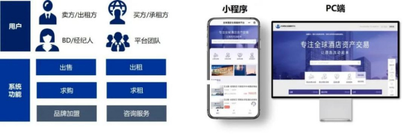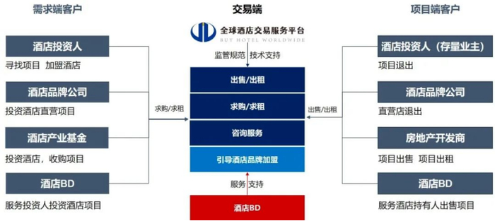 全球酒店交易服务平台,顾名思义,核心价值在于撮合酒店资产与经营权的交易。该平台面向全国酒店投资人、酒店品牌公司,提供酒店经营权出售、酒店物业出售/出租、酒店经营权求购、酒店物业求购/求租、酒店品牌加盟以及酒店交易过程中的咨询服务,包括估值、市场调研、投资咨询、品牌筛选、法律/财务/工程尽职调查等服务内容。