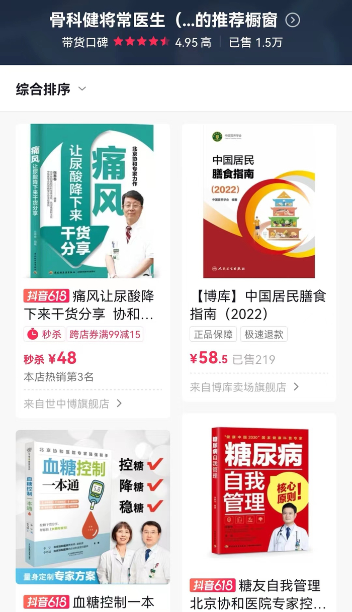 可以看到,一些简介为三甲医院医生的小红书达人开通了小红书店铺。同上述在抖音带货的医生主播相似,这些店铺销售的商品与药品无关,大多是书籍、课程等。