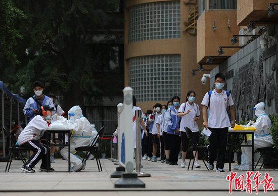 6月8日,北京市朝阳区陈经纶中学考点,考生们在结束高考第二天下午外语科目的考试后,在校门口排队接受核酸检测采样。据了解,今年高考期间,按照北京教育考试院安排,6月7日、8日下午考试结束后,由考点统一组织考生进行核酸检测,确保考生满足考试防疫相关要求。中青报·中青网记者 陈剑/摄
