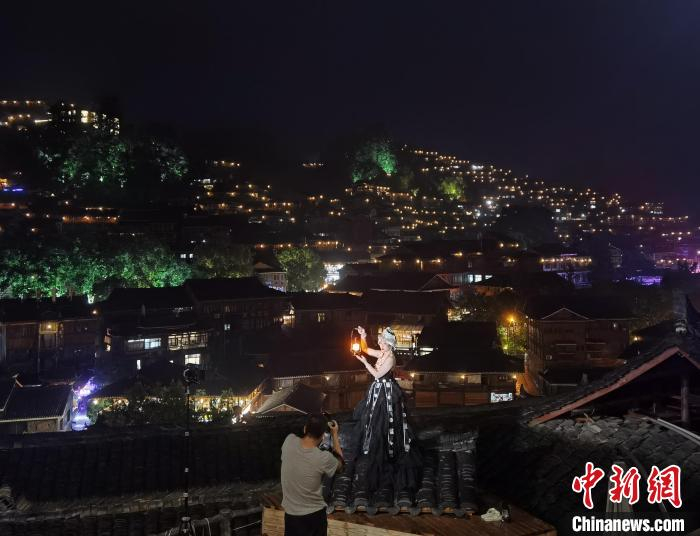 记者在西江千户苗寨的核心区域看到,几乎每隔三四家商铺就有一家旅拍店,不管是白天还是夜晚,在古街巷道、风雨桥上、吊脚楼旁,随处可见化妆师、摄影师、灯光师围着“苗寨姑娘”忙前忙后。