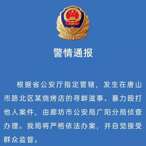 6月11日23时许,河北廊坊市公安局官方微博发布消息称,据河北省公安厅指定管辖,发生在唐山市路北区某烧烤店的寻衅滋事、暴力殴打他人案件,由廊坊市公安局广阳分局侦查办理。