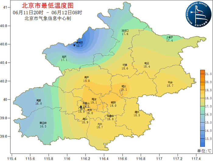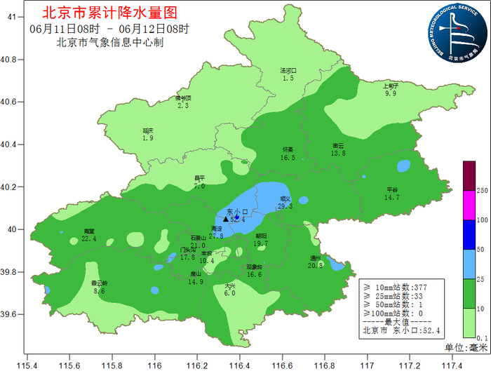市气象台发布11日8时至12日8时降水量(毫米):全市平均14.3,城区平均(朝,海,丰,石,东,西)18.0,东北(密,顺,平,怀)15.4,东南(通,大)15.1,西南(门,房)14.7,西北(延,昌)7.6,城区最大海淀西小口45.8,全市最大昌平东小口52.4,最大小时雨强昌平东小口32.5毫米/小时(11日20时-21时)。