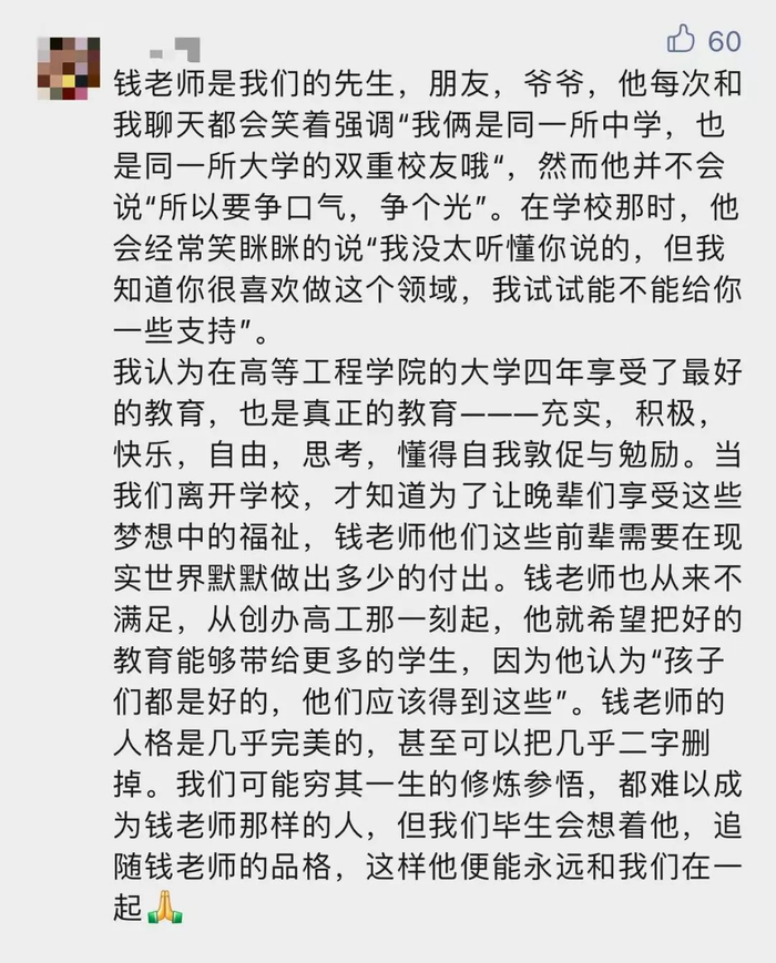 钱士湘同志为北航和计算机学院、高等理工学院做出了杰出贡献,为教育事业鞠躬尽瘁,永远是我们学习的楷模,他的逝世是北京航空航天大学的重大损失,我们痛失了一位好教授,我们沉痛悼念并深切缅怀钱士湘同志!我们将化悲痛为力量,学习、传承和弘扬钱士湘同志的优秀品质、大爱品格和科学精神,为祖国教育事业的发展接续奋斗!