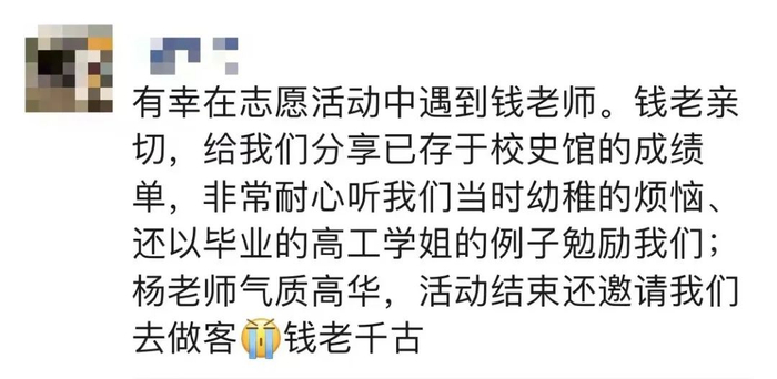 钱士湘先生与学生亦师亦友,亲如家人,他始终对学生关爱、关心、关注,注重学生的全面发展,与学生结成了深厚的友情,是学生的“大家长”,是育人的“大先生”。很多学生亲切称呼他“钱老”或爷爷。