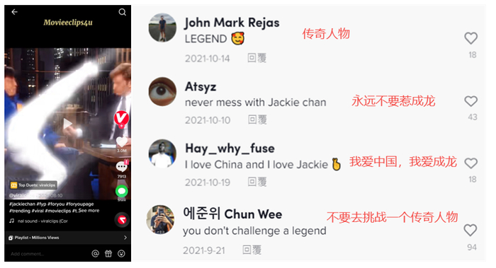 海外新媒体的数据和案例分析显示,个人效应的影响因素不可忽视。其中既包括全球知名度高的明星,也不乏原本籍籍无名的素人。李小龙、成龙等具有国际影响力的武术明星目前为止带来了20多亿次的视频播放量,大量展现两人不凡身手的视频在TikTok持续形成爆款,直接推动了中国武术的话题热度。