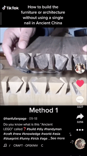 在TikTok上,最热门的一条视频播放量高达5250万。创作者演示了如何利用榫卯构造将两块木构件牢牢结合在一起。另一位创作者@hanfupage展示了如何不用一颗钉子盖房子、做家具,这段视频获得了770万播放。评论区海外网友纷纷表示,“中国人实在太有才了!”、“这是真正的工匠精神!”
