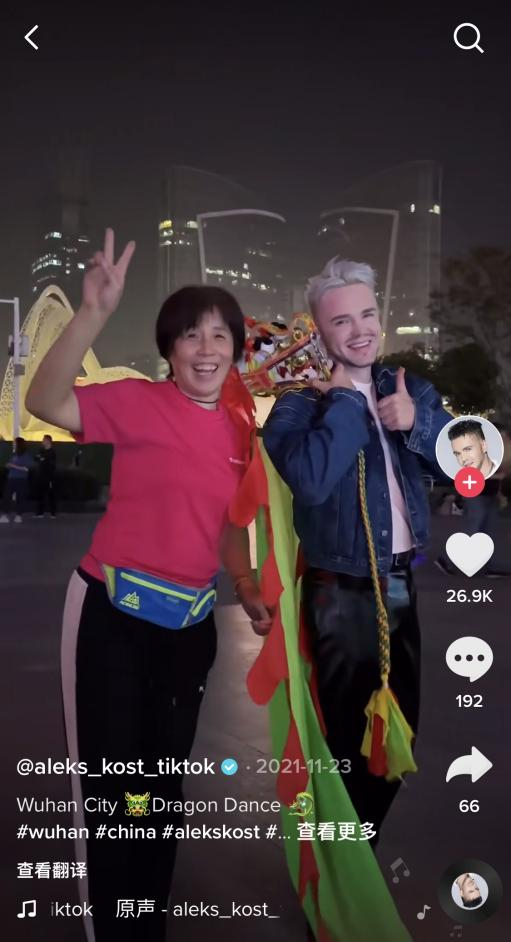 一些外国友人不禁跃跃欲试,其中来自乌克兰的Aleks Kost发布了他在武汉跟阿姨学龙舞的视频。