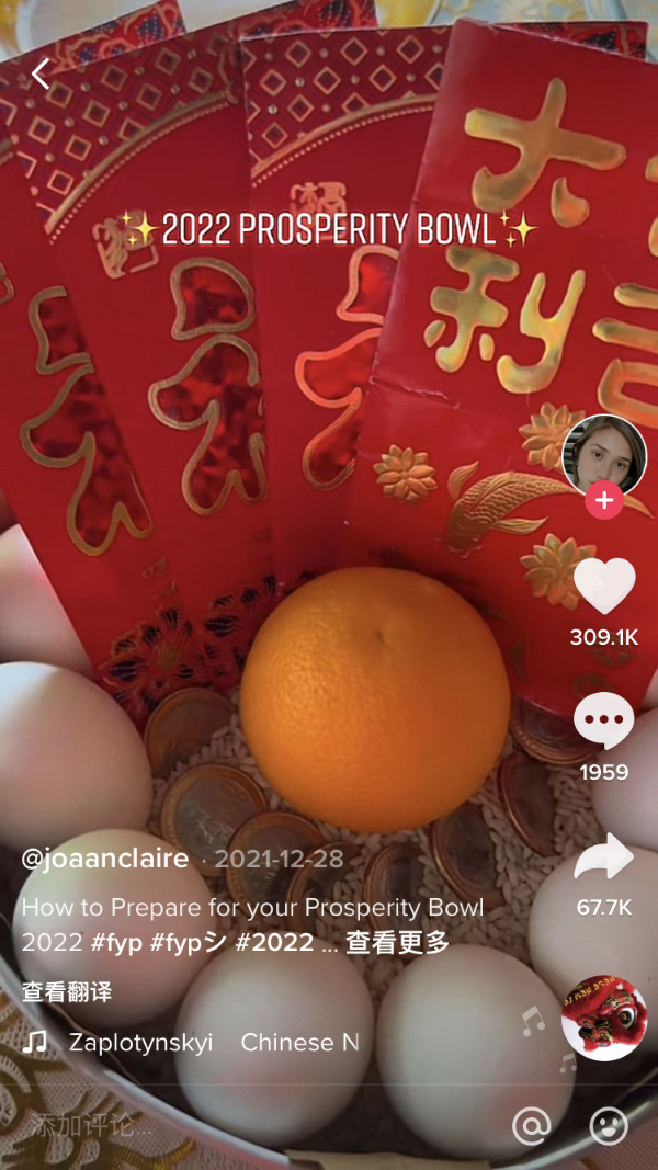 来自东南亚的网友@joaanclaire介绍当地一种特别的习俗:“丰收碗”。人们在碗底堆满一层厚厚的生糯米,沿着糯米放置12颗熟鸡蛋,代表新年的12个月。此后,在丰收碗的正中间放入8枚硬币,寓意全年财源滚滚,硬币里再放一个橘子,象征吉祥福气。最后再把一叠红包插入碗中,便是一年的好丰收。这则视频播放量超过470万,逾30万网友点赞表示“学到了”。