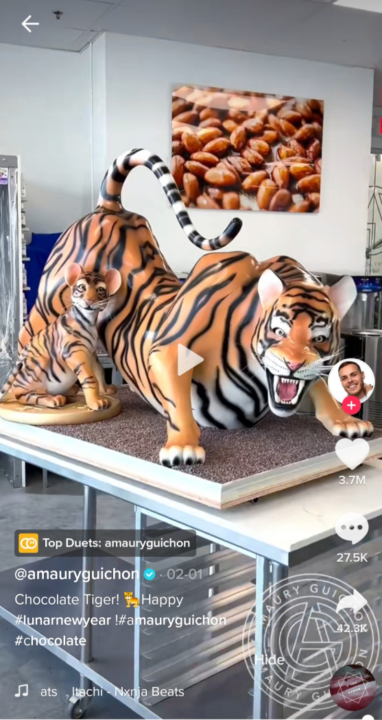 2022年是农历虎年。为了庆祝中国虎年,法国糕点师Amaury Guichon用巧克力做出了一大一小两只老虎。大老虎双目圆睁、张口咆哮,充满百兽之王的霸气。小老虎坐在一个金光灿灿的中国铜板上,铜板上还用中文写着“新年快乐”四个大字。从流动的巧克力液,到栩栩如生的老虎,这项手艺获得了近5000万次播放量,不少网友表示看呆了。