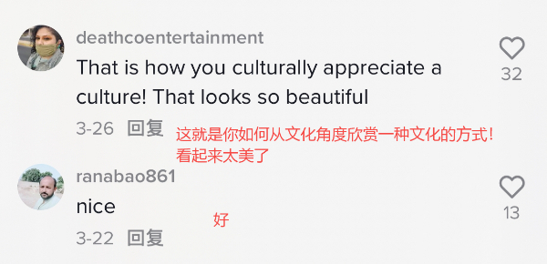 作为热门的海外社交平台,TikTok上有大量的非遗传承人以及爱好者自发地分享中国非遗文化的相关内容,在高赞视频下方的评论区里,来自各国的网友用不同种类的语言表达了对中国非遗文化的肯定和热爱。
