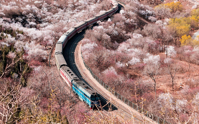2021年4月2日,和谐号列车穿过居庸关花海。图/IC photo