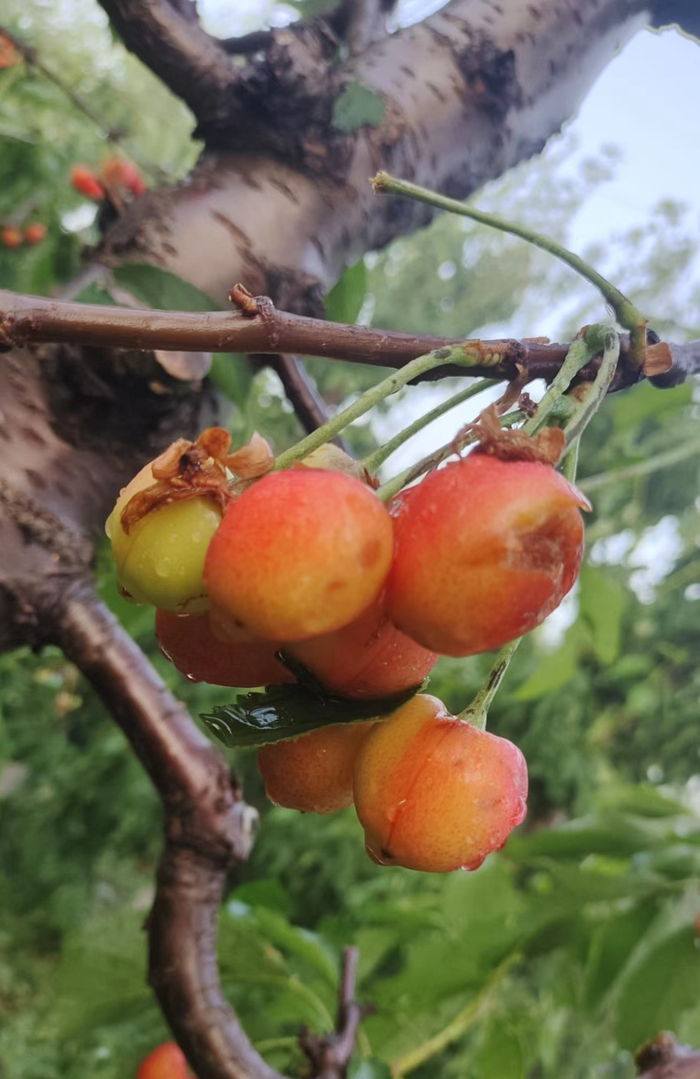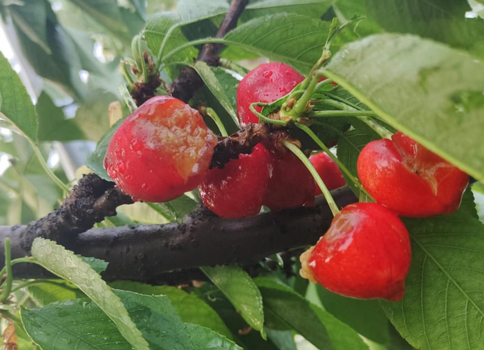 西集沙古堆村曹女阳光农场相关负责人介绍,农场及周边樱桃园也受到了本次雹灾影响,砸伤了部分樱桃,另外受近期降雨量较大影响,导致樱桃烂果率上升。不过好在受到影响的主要是处于晚果期的樱桃,前面盛果期樱桃已经通过电商、线上直播等平台销售大半,果园整体虽然受到雹灾影响但影响有限。
