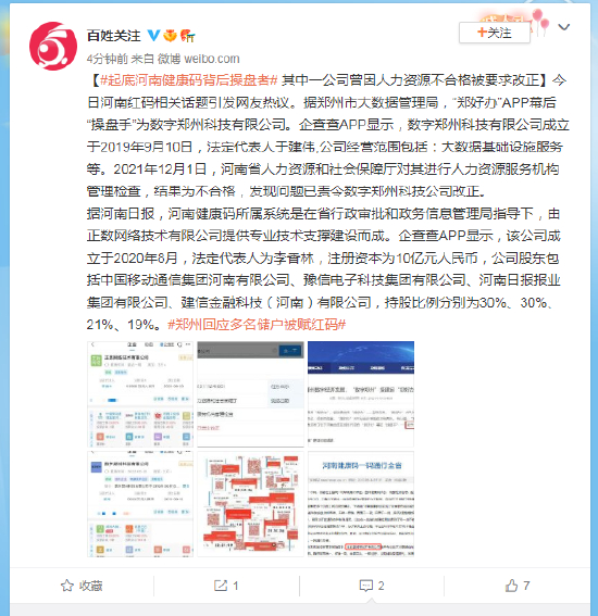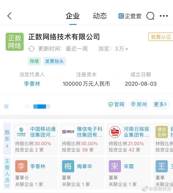 据河南日报,河南健康码所属系统是在省行政审批和政务信息管理局指导下,由正数网络技术有限公司提供专业技术支撑建设而成。企查查APP显示,该公司成立于2020年8月,法定代表人为李香林,注册资本为10亿元人民币,公司股东包括中国移动通信集团河南有限公司、豫信电子科技集团有限公司、河南日报报业集团有限公司、建信金融科技(河南)有限公司,持股比例分别为30%、30%、21%、19%。#郑州回应多名储户被赋红码#