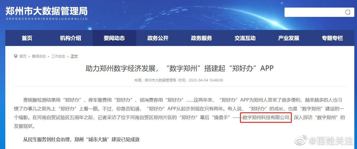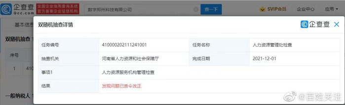 今日河南红码相关话题引发网友热议。据郑州市大数据管理局,“郑好办”APP幕后“操盘手”为数字郑州科技有限公司。企查查APP显示,数字郑州科技有限公司成立于2019年9月10日,法定代表人于建伟,公司经营范围包括:大数据基础设施服务等。2021年12月1日,河南省人力资源和社会保障厅对其进行人力资源服务机构管理检查,结果为不合格,发现问题已责令数字郑州科技公司改正。