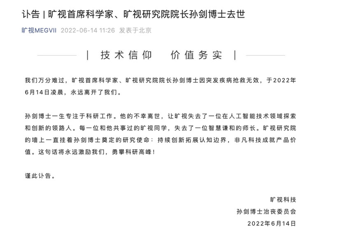 中国人工智能企业旷视科技6月14日发讣告称,该公司首席科学家、旷视研究院院长孙剑博士因突发疾病抢救无效,于2022年6月14日凌晨去世。