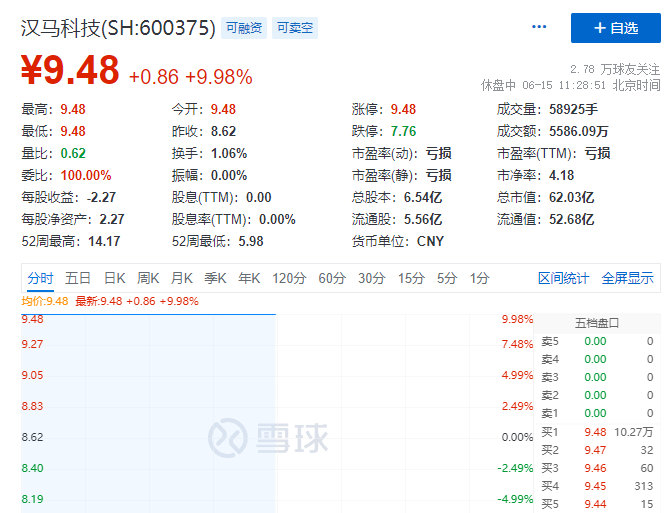 6月15日,汉马科技开盘一字涨停,截至午间收盘仍封死涨停板,报9.48元/股,总市值为62亿元。