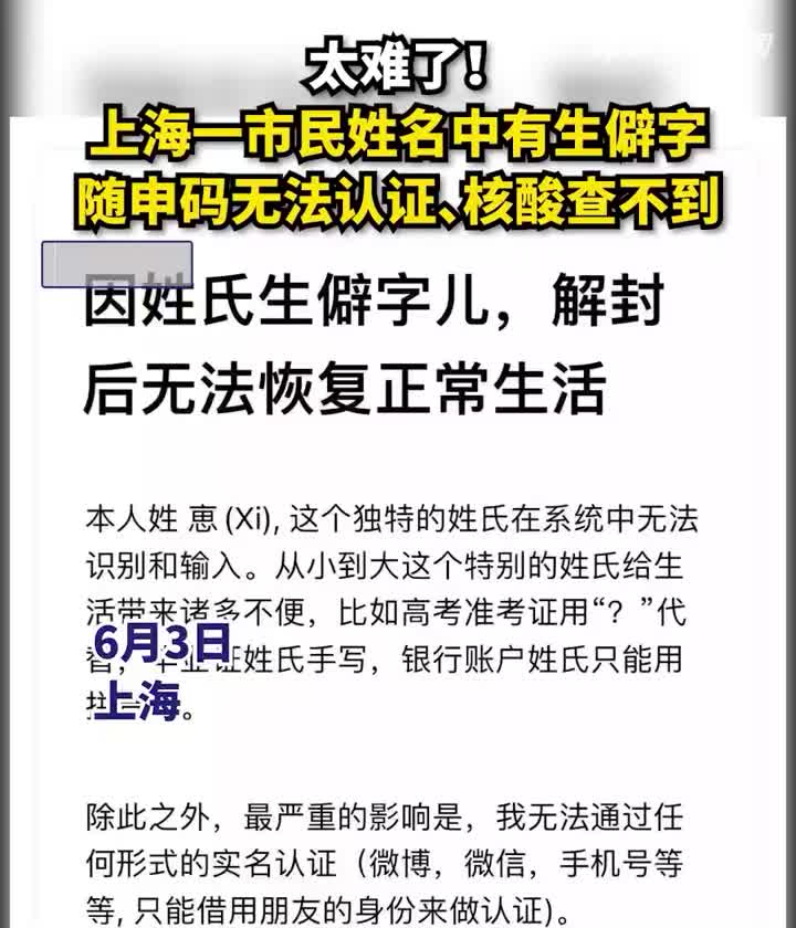 太难了!上海一市民姓名中有生僻字,随申码无法认证、核酸查不到