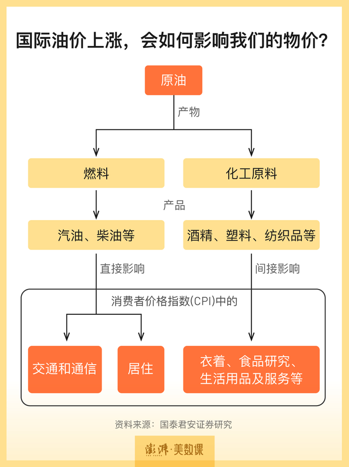以衣食住行为例,日常的衣服面料如尼龙、涤纶等合成纤维来自于石油产出的原材料;石油是化肥中最主要成分氮肥的原料之一,油价上涨会拉动化肥价格提升,从而导致农产品种植成本增加,并推涨粮食价格;而在居住方面,石油化工直接影响到水电燃料费用的支出。