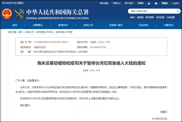 10日,海关总署动植物检疫司发布通知称,去年以来,大陆海关多次从台湾地区输大陆石斑鱼中检出孔雀石绿、结晶紫禁用药物,还检出土霉素超标。为防范风险,决定自2022年6月13日起暂停台湾地区石斑鱼输入大陆。