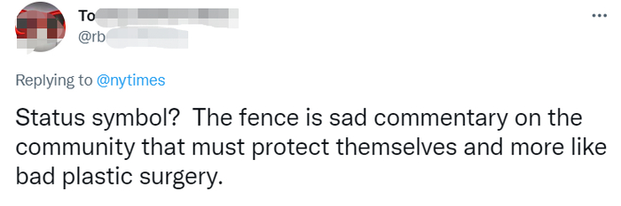 “地位的象征?栅栏是对社区的悲哀的反映,居民必须保护自己,这更像是场(对社区进行的)糟糕的整形手术。”