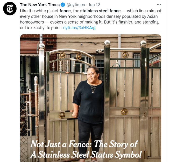 6月14日,纽约时报中文网发表了一篇名为《从中国走向纽约:不锈钢栅栏成中产家装新风尚》的文章,称这种银色、时而点缀着金色的栅栏已经从纽约亚裔社区流行开来,成了当地中产阶级的“新标志”。