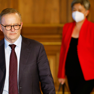 5月24日,日本东京,澳大利亚新任总理阿尔巴尼斯与新任外长黄英贤(后)准备与日本首相岸田文雄举行会谈。此前一天的5月23日,阿尔巴尼斯就任总理当天抵达日本,参加美日印澳“四方安全对话”峰会。人民视觉供图