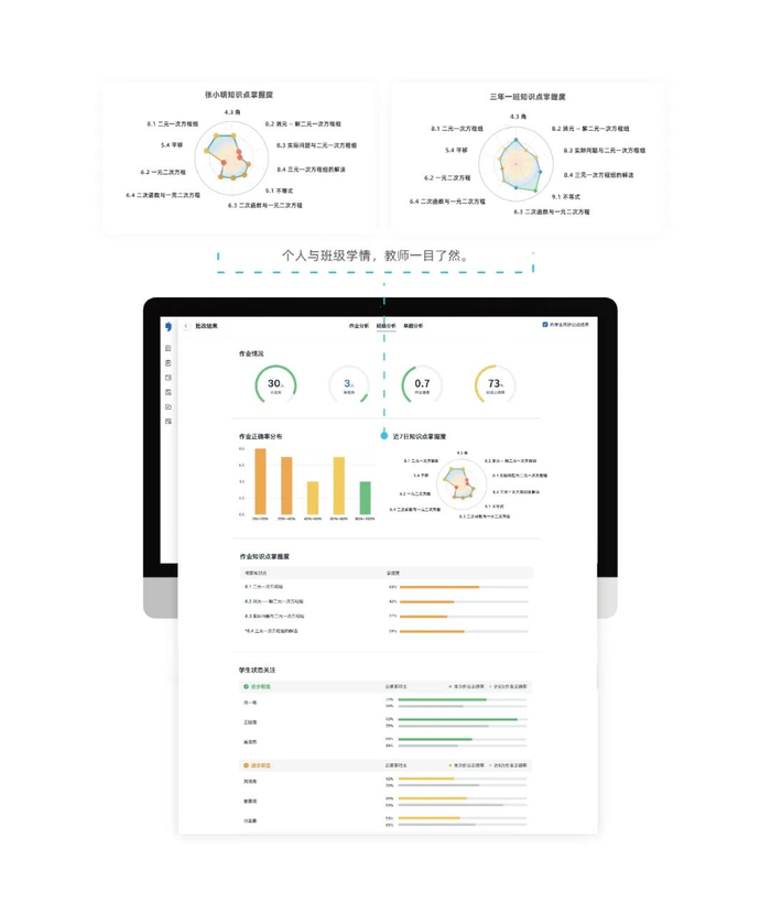 “双减”背景下,为教师减负赋能也同样重要。近日,作为“双减”工作试点地区的北京明确支持采购校外资源,其中课程资源类能够有效丰富校内供给,同时减轻教师负担。“飞象智能作业系统”即是精准助力:使用该系统老师既能个性化地为学生布置作业,也能全学科基本题型一秒批改,复杂题型精准识别;批改完成后,作业数据将自动上传到后台,系统同步生成个性化的学习报告,并支持家长端实时同步。