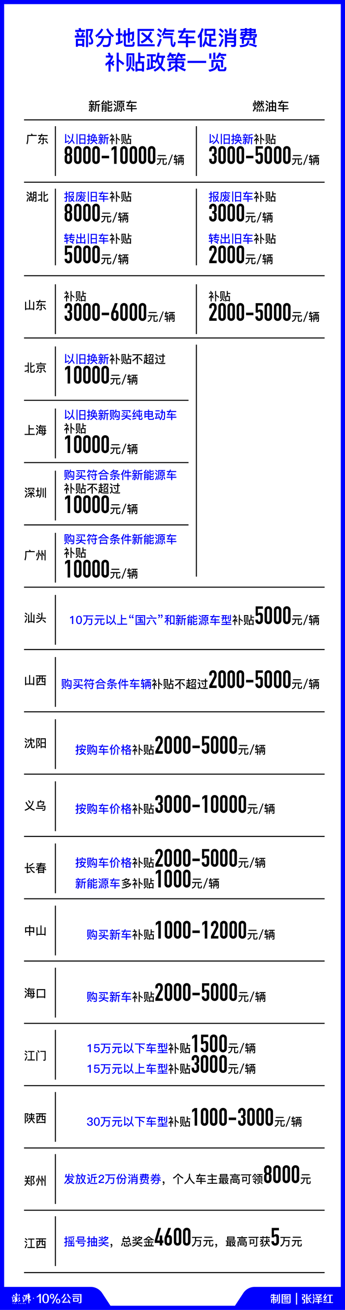 广东、湖北、山东、江西等省,以及中山、江门、珠海、广州、深圳、汕头、沈阳、长春、北京、天津、郑州、太原、西安、上海、宁波、义乌、福州、晋江、海口等城市,均推出补贴政策,向符合条件的消费者发放购车补助或消费券,金额从2000元至上万元不等。此外,还有上海嘉定、深圳南山等也推出了区内补贴政策。