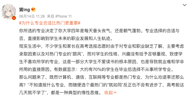 #冷门专业会一直冷下去吗#、#为什么专业合适比热门更重要#、 #大学专业怎么选#等话题近日已成为热点话题。不少网友以过来人的身份表明了态度和建议↓↓↓