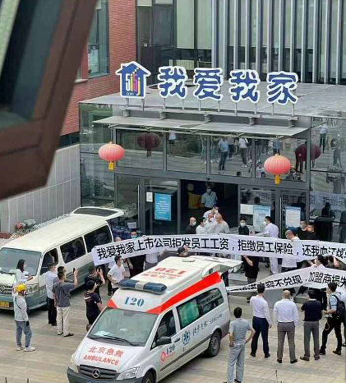 6月17日下午,一张有关“我爱我家上市公司拒发员工工资,拒缴员工保险,还我血汗钱!”和“。。。内容不兑现,加盟商损失。。。”的维权照片在业内流传,维权地点正是在我爱我家北京北苑总部。