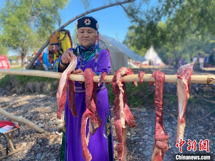 “以前在山上生活的时候,没有办法冷冻储藏肉类,只能把肉晒干,防止它变质。”60岁的葛玉轻一边在斜仁柱外面的桦树干上晒肉条,一边给记者讲述鄂伦春族在山岭间生产生活的故事,“打猎过程中,没有鲜肉的情况下,就吃干肉。”