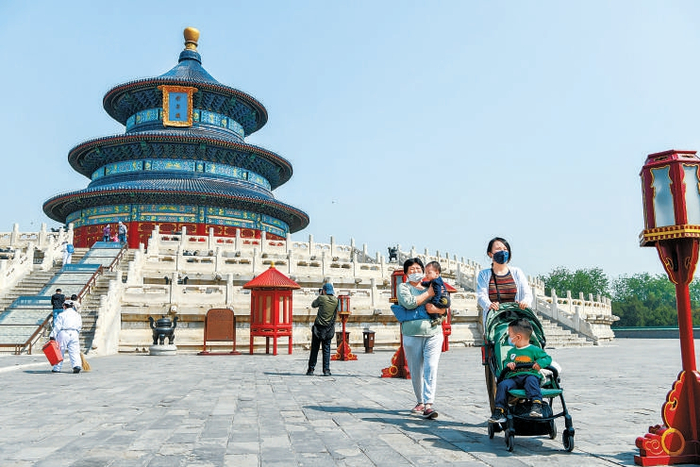夏日北京,蓝绿交织。位于中轴线南端的天坛,风动蝉鸣,庄严静谧。外坛内侧,7600平方米的街边公园里,国槐成荫、泡桐蔽日、蔷薇绚烂,行人惬意休闲。