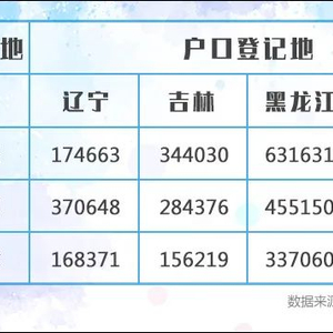其中,在山东,户口登记地在辽宁的人口为174663人,户口登记地在吉林的为344030人,户口登记地在黑龙江的为631631人,合计1150324人。也就是说,在山东,户口登记地在东北的人口超过115万人。