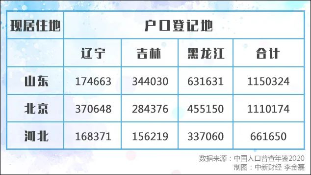 可见,居住在山东、北京的东北人口均超过100万人,是东北人口外流的最主要的两个目的地。