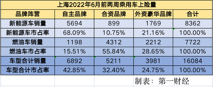 但是6月前两周的上险数却显示了相反的结果——自主品牌市占率达到了前所未有的42.85%,合资品牌市占率提高到32.4%,豪华车市占率下滑到24.75%。背后的奥秘则在于“新能源”——新能源车改变了上海车市的势力天平,曾经弱势的自主品牌一举跃升为市场的主导者;而曾经占据最大份额的合资品牌,则出现了明显的中部坍塌现象。