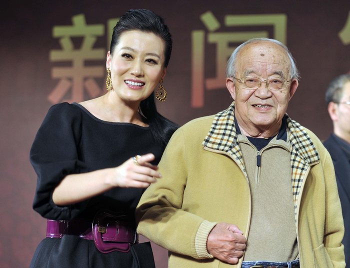 2009年11月,中国歌剧舞剧院编排的歌舞剧《在那遥远的地方》在北京举行发布会,主演谭晶与中国歌剧舞剧院前任院长乔羽合影。新京报记者 郭延冰 摄影