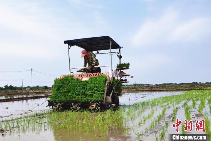 中新网安徽铜陵6月20日电 (成展鹏 方盼亮 吴彬)6月20日,在安徽省铜陵市枞阳县金社镇“种子小镇”水稻繁育种基地里,绿油油的秧苗整齐排队,与翩跹起舞的白鹭相映成趣,绘就成一幅和谐美丽的田园画卷,种粮大户王玉生驾驶着插秧机在田间往来穿梭。