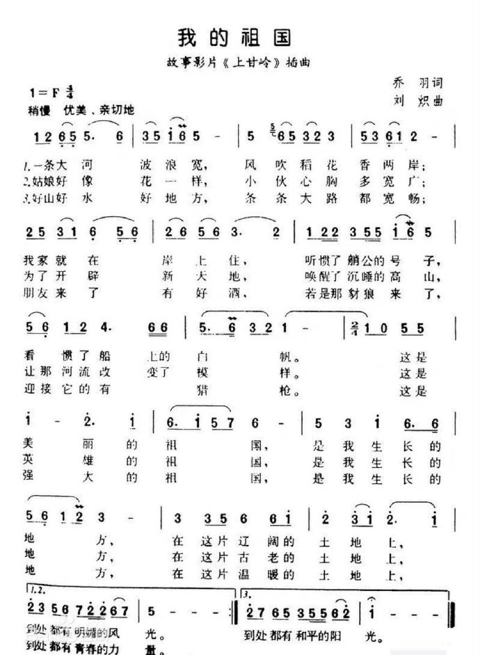 这首歌,最初定名为《一条大河》,后来在乔羽的老搭档作曲家刘炽建议下,改名叫《我的祖国》。在乔羽建议下,这首歌由郭兰英演唱,最先由中央人民广播电台播放。电影尚未上映,歌曲便已风靡全国。无数年轻人,在这首歌的激励下,奔赴祖国各地的建设岗位。