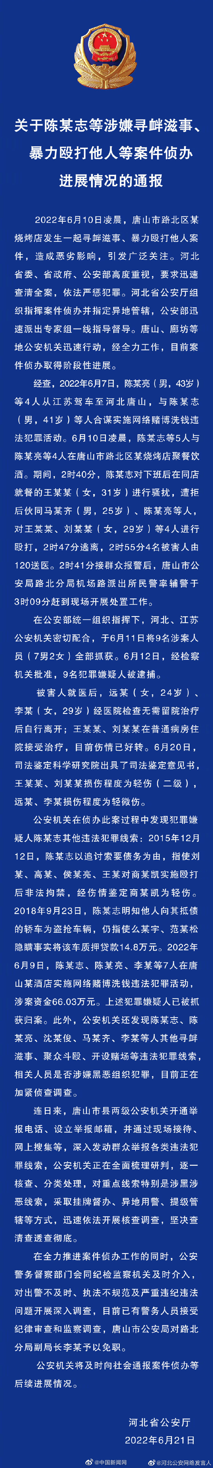 河北通报唐山打人事件最新进展:4名受伤女子轻伤或轻微伤