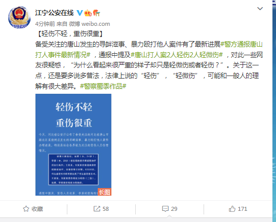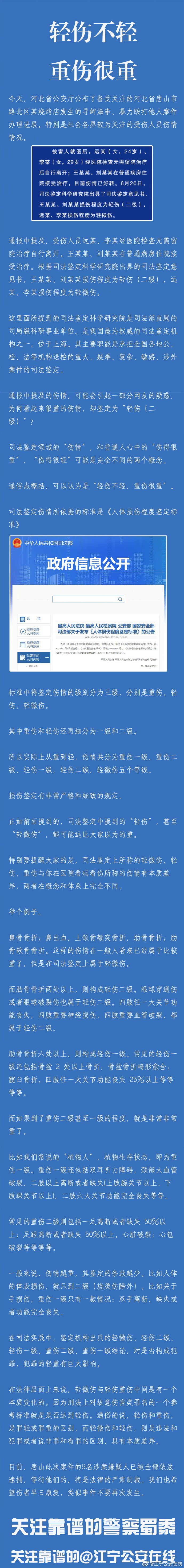 备受关注的唐山发生的寻衅滋事、暴力殴打他人案件有了最新进展#警方通报唐山打人事件最新情况# ,通报中提及#唐山打人案2人轻伤2人轻微伤# ,对此一些网友很疑惑,“为什么看起来很严重的样子却只是轻微伤或者轻伤?”。关于这一点,还是要多说多普法,法律上说的“轻伤”,“轻微伤”,可能和一般人的理解有很大差异。