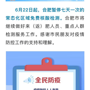 6月22日起,合肥暂停七天一次的常态化区域免费核酸检测。合肥市将继续做好来(返)肥人员、重点人群检测服务工作。