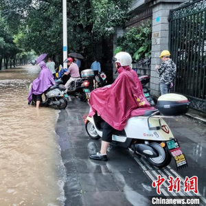 当天下午5时左右,记者在桂林市环城北二路桂花园路口看到,该处道路积水严重,水深处已没过膝盖,不少民众提着鞋子,涉水前行。附近一家中学门口,来接孩子放学的家长比平时增多,一些家长还为孩子准备了雨鞋。
