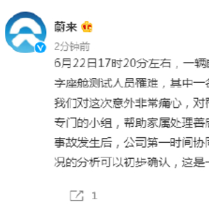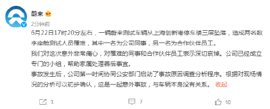 6月22日17时20分左右,一辆蔚来测试车辆从上海创新港停车楼三层坠落,造成两名数字座舱测试人员罹难,其中一名为公司同事,另一名为合作伙伴员工。